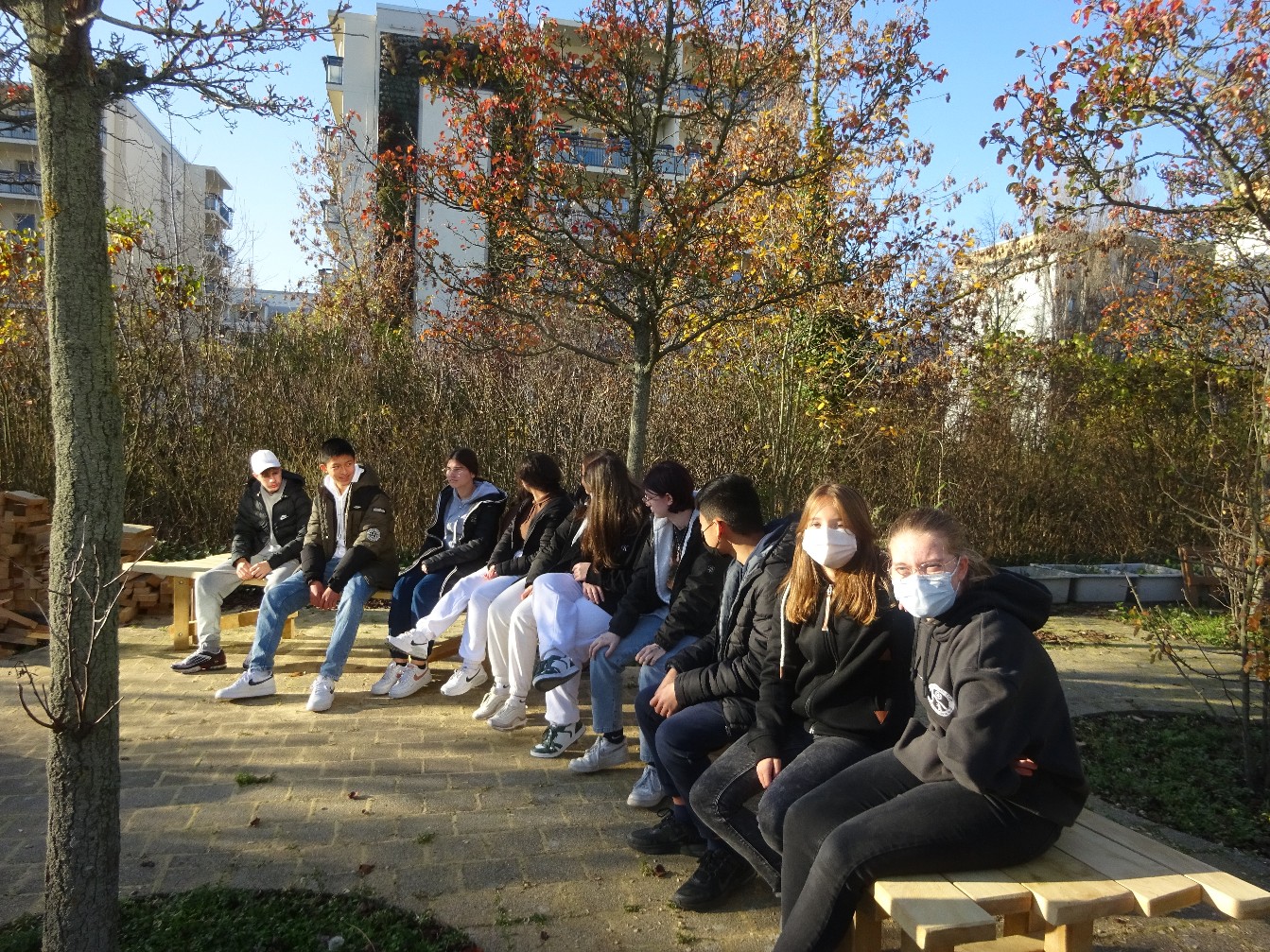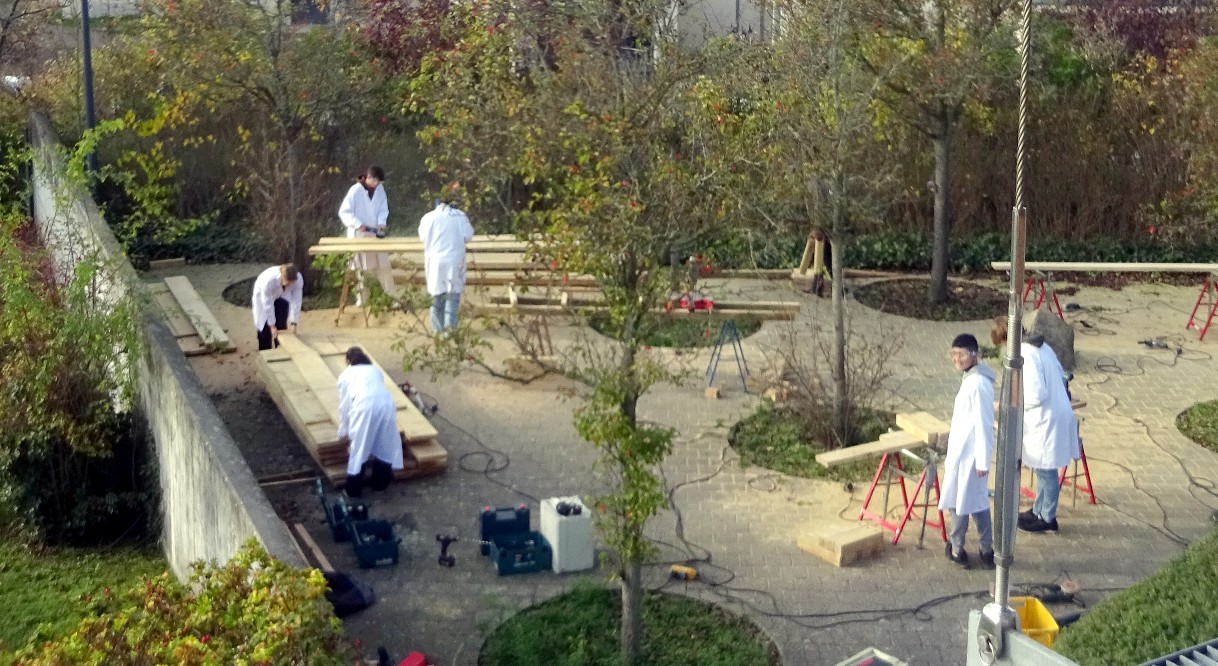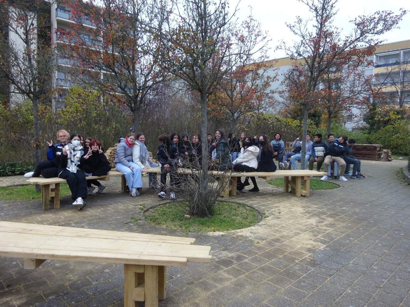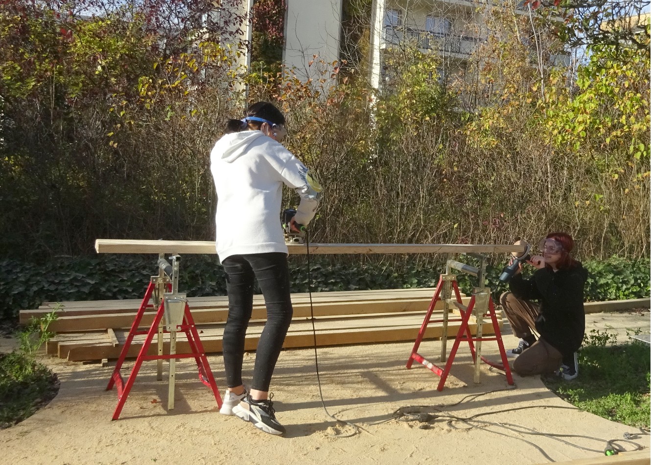In der Woche vom 7. bis 11. November 2022 haben die Schülerinnen und Schüler der Klassen 9/1 und 9/2 auf unserem Schulhof Sitzbänke gebaut, die im Sommer als „Grünes Klassenzimmer“ genutzt werden können. Gemeinsam mit dem Holzgestalter Lucas Fritsch wurden riesige Holzbretter zersägt, geschliffen, gebohrt, verschraubt und zu stylischen Sitzgelegenheiten zusammengebaut.